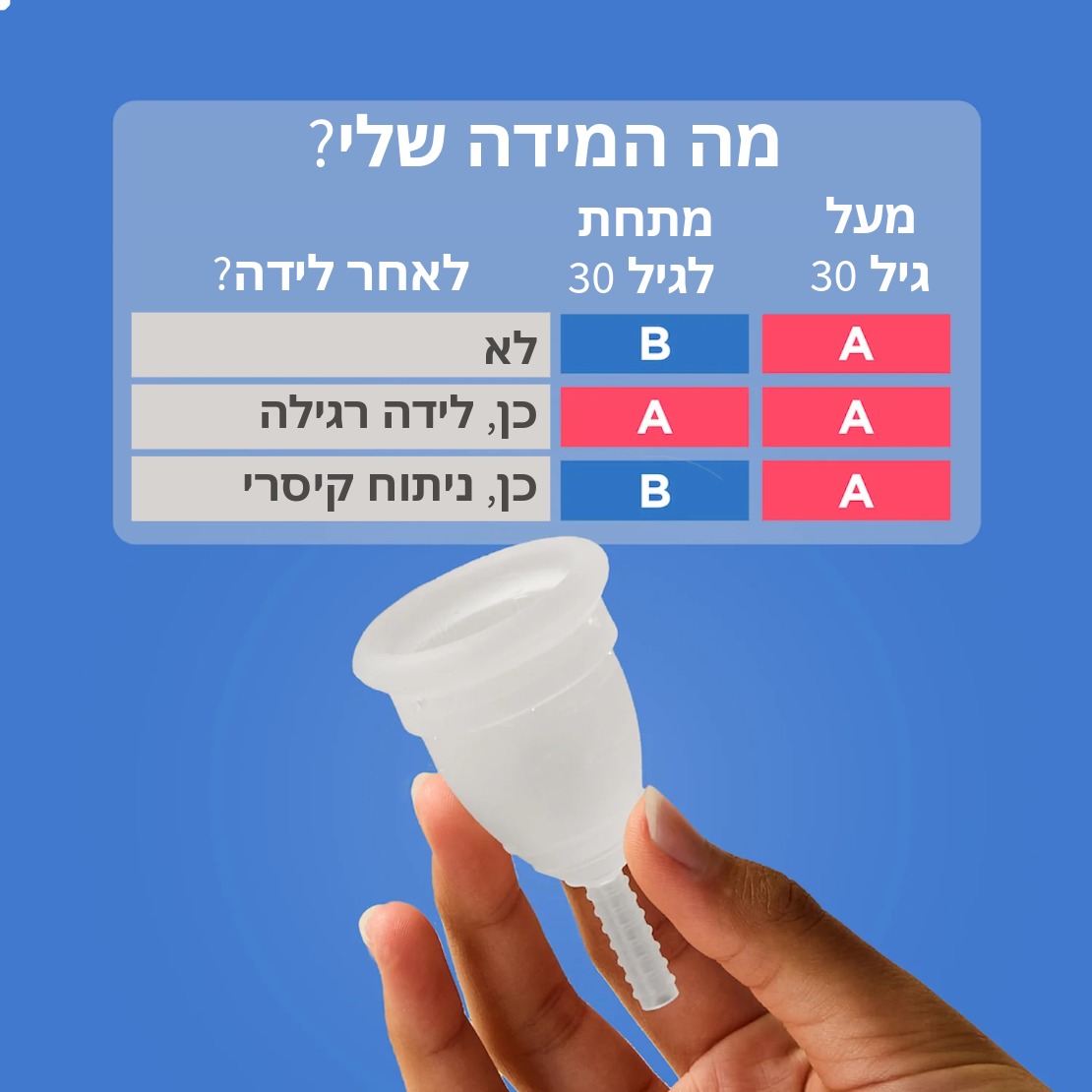 – מידה A מיועדת לנשים לאחר לידה או לנשים מעל גיל 30.